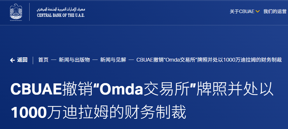 阿联酋央行又出手!Omda Exchange牌照一刀切,罚款千万!