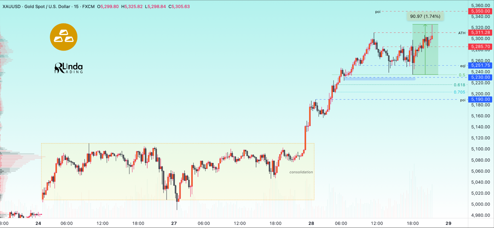 XAUUSDmencapai level tertinggi baru 5311 dan memasuki fase koreksi (profit-taking) menjelang pertemuan suku bunga Fed... Situasi mendasar Ketegangan antara AS dan NATO terkait rencana Greenland. Ancaman Trump untuk mengenakan tarif 100% pada barang-barang dari Kanada. Negosiasi yang tidak membuahkan