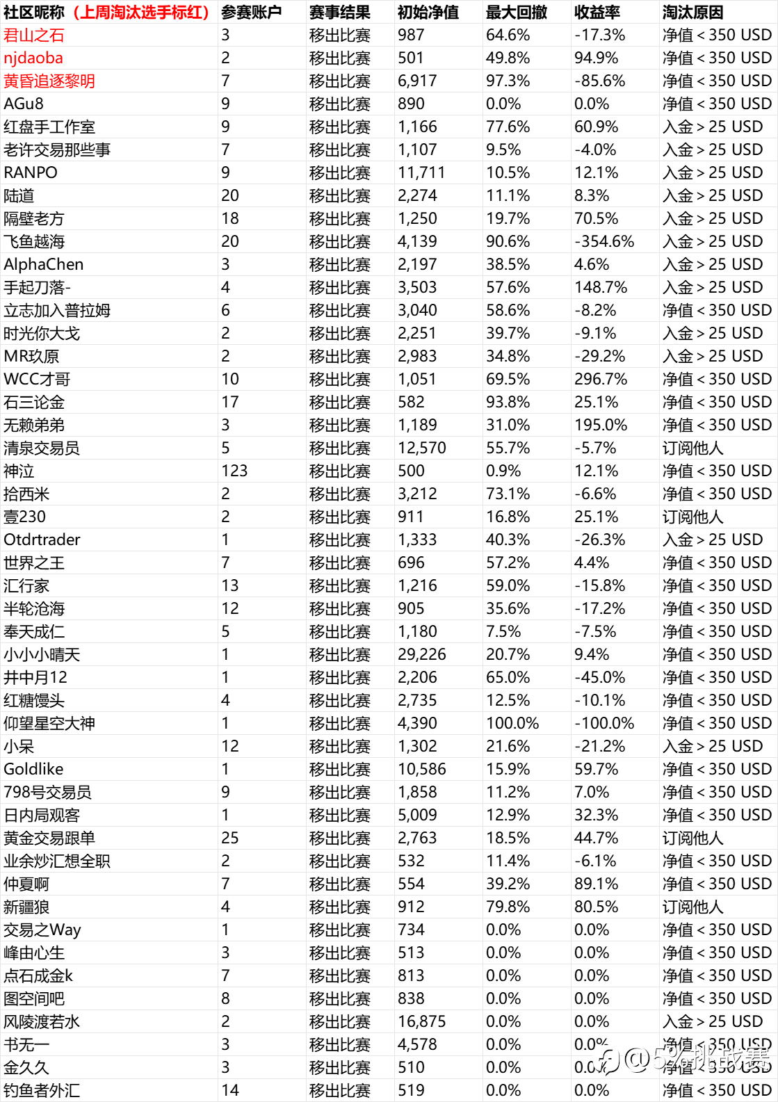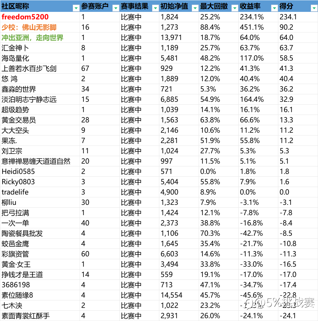 5%挑战赛的宗旨:与优秀交易员同行。 淘汰名单:原因:1、净值低于500美金,2、订阅他人信号,3、入金>25美金 时光荏苒,5%挑战赛已经举办两届,综合赛事现状与实际操作多元化,本届将以全新规则进行,不再只限于某一种风格,具体如下: ★资金要求:社区认证平台,净值≥500美金 ★大赛规则:不允许订阅他人,不允许入金 ①、回撤<30%,盈利X%,计X分 ②、≥30%回撤<50%,盈利X%,计0.5*X分 ③、≥50%回撤<99%,盈利X%,计0.2*X分 注明:实际得分=盈利率/1%*回撤系数 ★报名时间:北京时间2025年8月1日06:00:00——