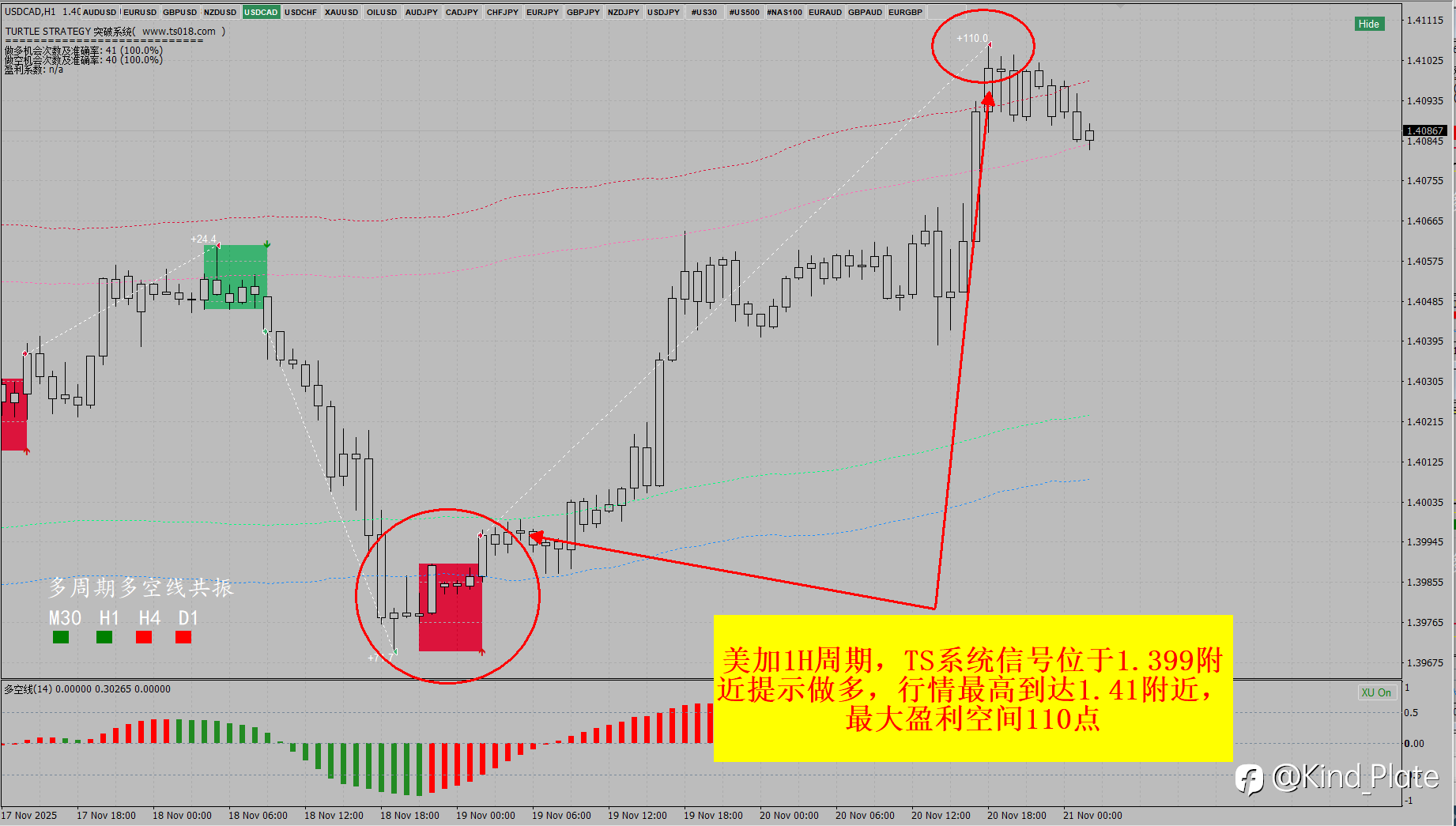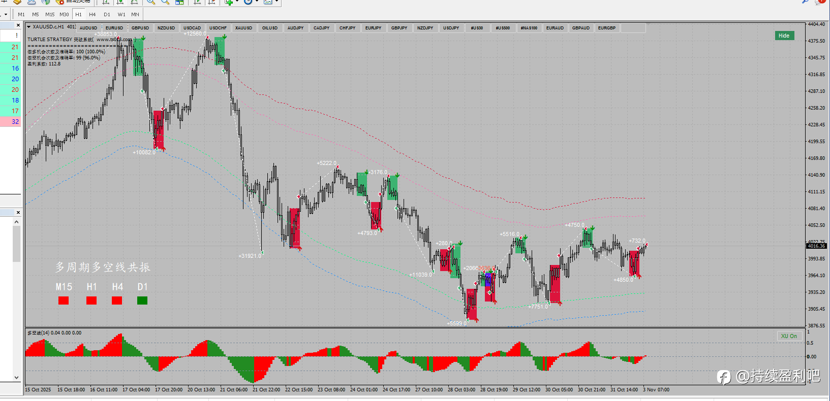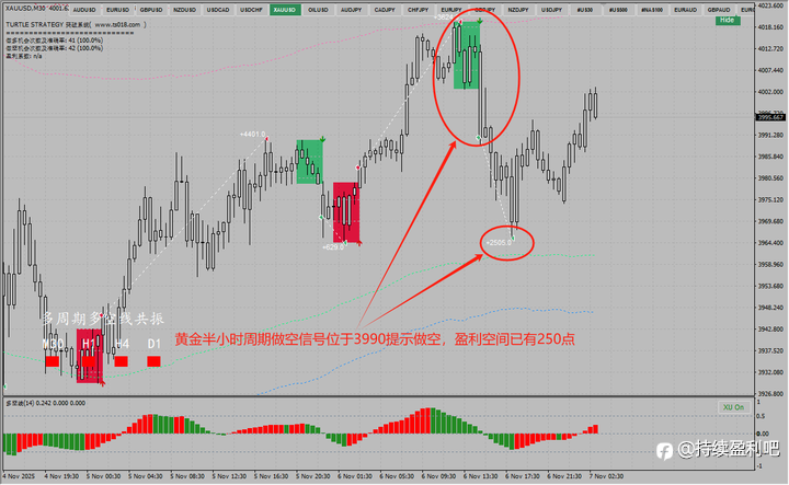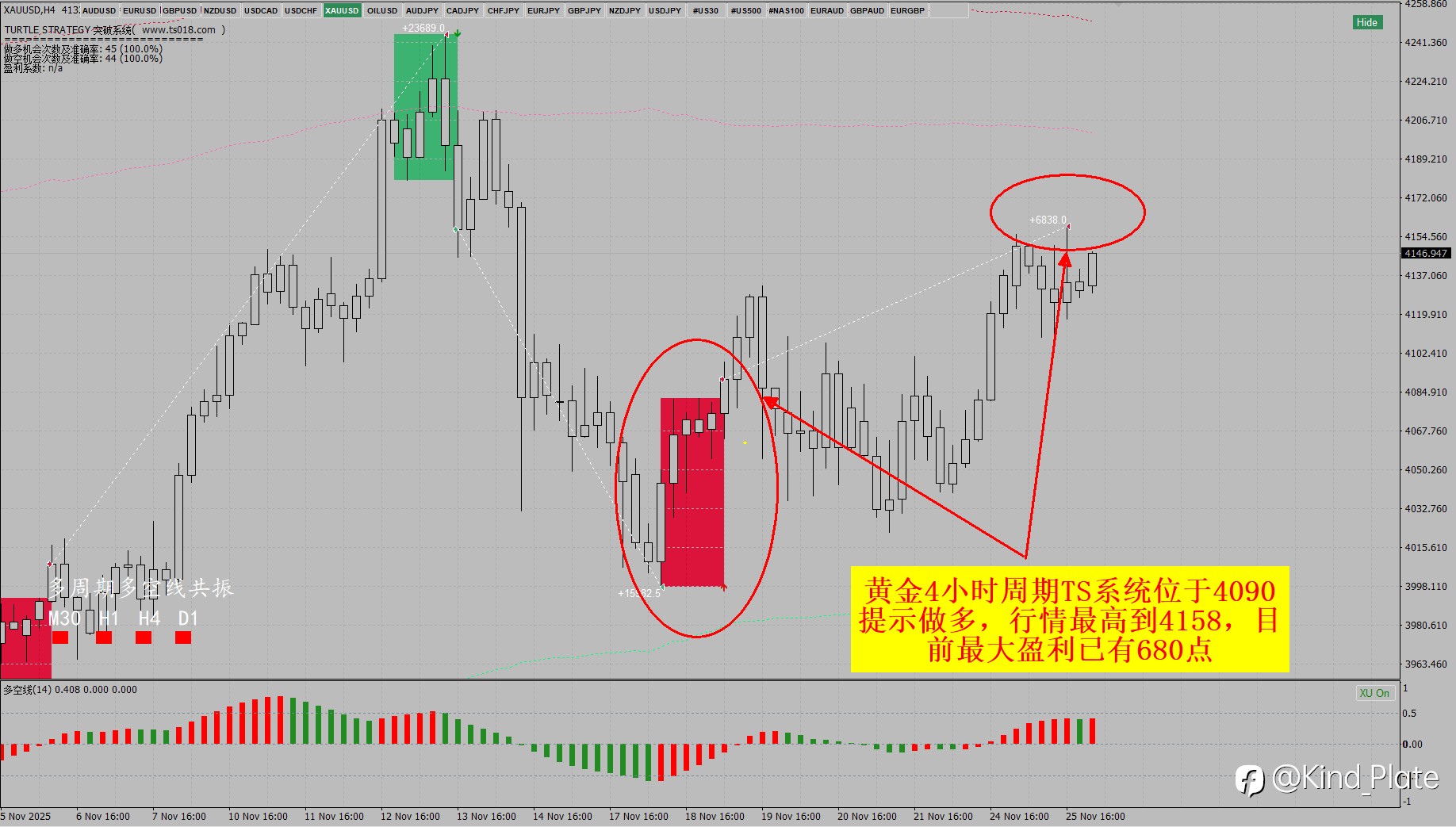 黄金4090位置TS系统提示做多,目前位于4152,最大盈利可到600多点。