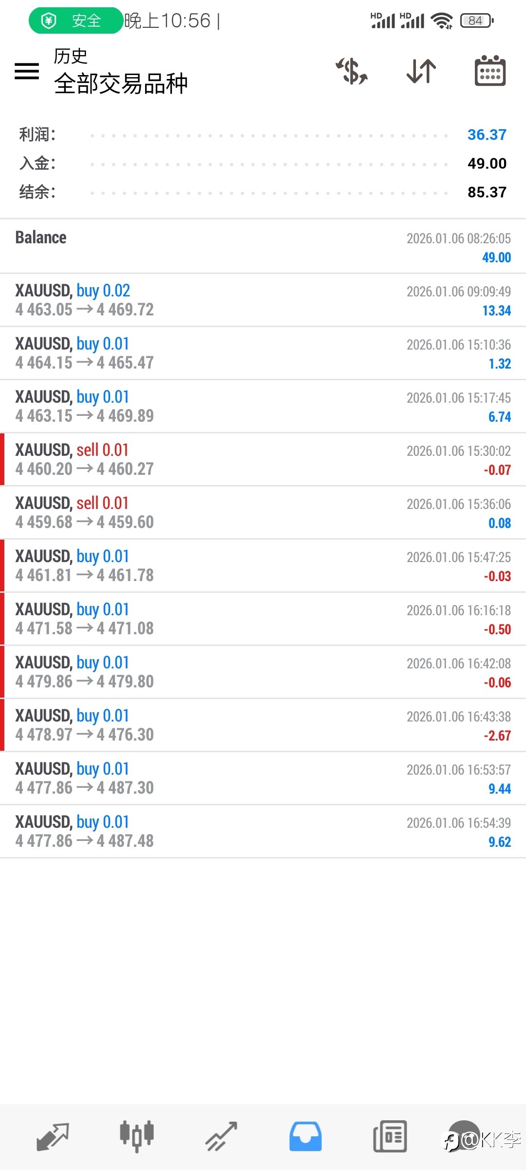 挑战几十U起家 第六次入金吧大概,入49U。 盈利36.37,盈利率74%。 胜率90.9%,11单正常止损1单,4单微损是保本被滑点。 IC果然滑点出名,这样很影响胜率数据。其余都好,无所谓。 美盘22:30开盘前节奏差,连续5...