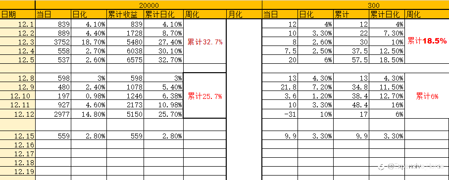 12.15号战绩分享 20000u跑了559u,日化在2.8% 300u跑了9.9u,日化在3.3% 本月详情见下图 量化ea,全实盘,可观摩,可合作