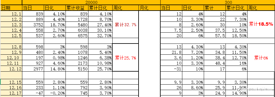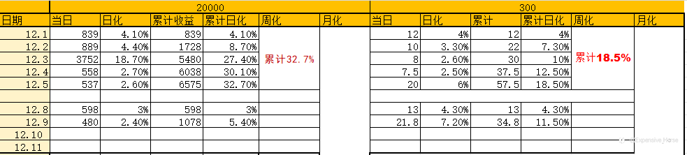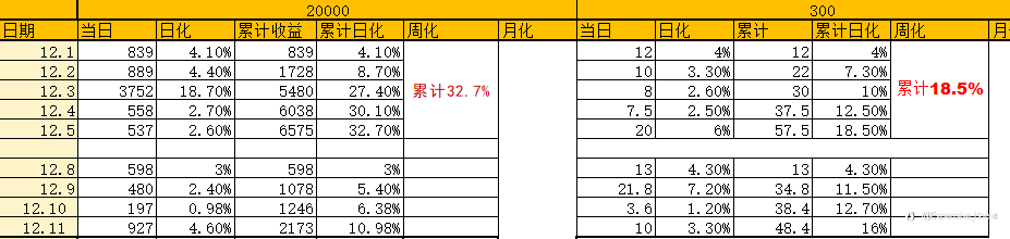 12.1-12.5 上周战绩分享 20000u上周跑了6577u,月化在32% 300u上周跑了58.6u,日化在19.5% 大家上周跑的怎么样? 感兴趣的可以来了咨询