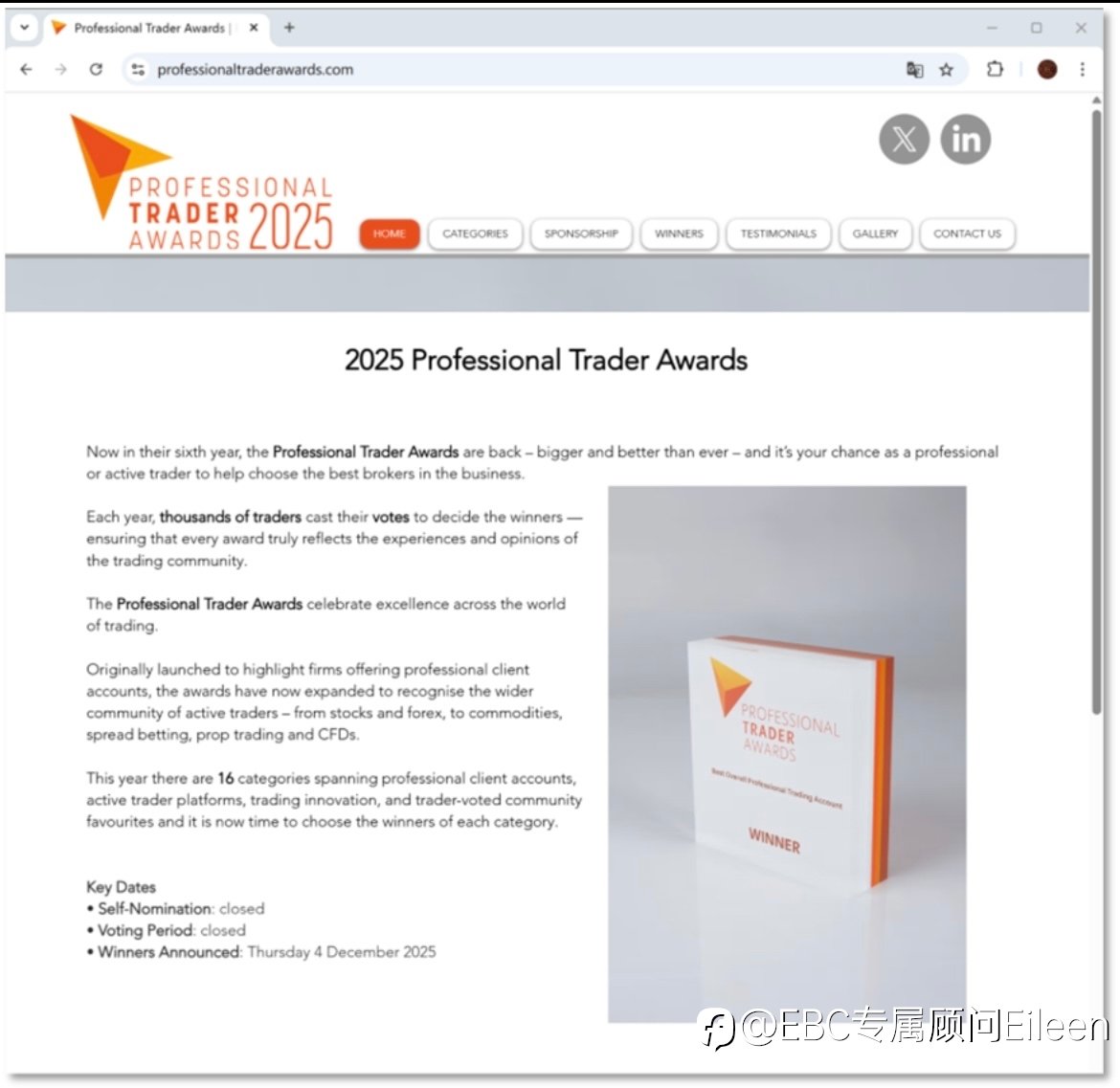 EBC金融集团在 2025 年 Professional Trader Awards(专业交易员大奖)评选中,斩获“全球最佳交易执行券商” 大奖。 这一奖项由全球超过100个国家、数万名专业交易者独立投票选出,代表着国际交易市场对 EBC 专业表现、技术实力与服务创新的高度认可。此次获奖,是继连续三年斩获“全球最佳券商”后,又一份“全球最佳”的见证。 认可,源于全球专业交易者真实体验 专业交易员大奖的评选过程以透明和公正著称。所有获奖者均由全球数万名专业交易者独立投票选出,这一过程不设评委席,不依赖专家意见,因“交易者视角、专业维度、透明机制”被熟知,它充分确保每一张选票都源自真实