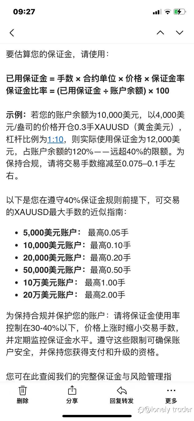 大家好,我来了 11月5号那天因为突发状况写了一篇,起因是收到自营平台违规警告和发现了后台的数据紊乱,今天说一下后续,也给关心自营考情况的兄弟做一个阶段汇报 首先是关于违规警告,通过多次发邮件与官方沟通,最终得到了回复 那个警告是针对我之前的2万考核账户,这个官方有给解释,因为发警告邮件的时间延迟了,让我误以为是分成账户的交易导致的。具体原因是保证金使用过多导致的过度杠杆化,说人话就是使用的保证金超过了他们规定的范畴,所以给予了一次警告,如果后续多次违规就可能造成账户挑战失败 我解释一下这其中的缘由 平台给的杠杆很低(具体是多少我还真没弄清楚),在挑战条款里面有这么一条:为保证合规并保护您的账