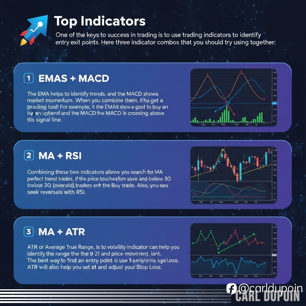 📈 Top Trading Indicator Combos • EMAs + MACD → trend + momentum • MA + RSI → trend pullbacks & reversals • MA + ATR → entries + volatility-based risk control Used together, indicators can h...