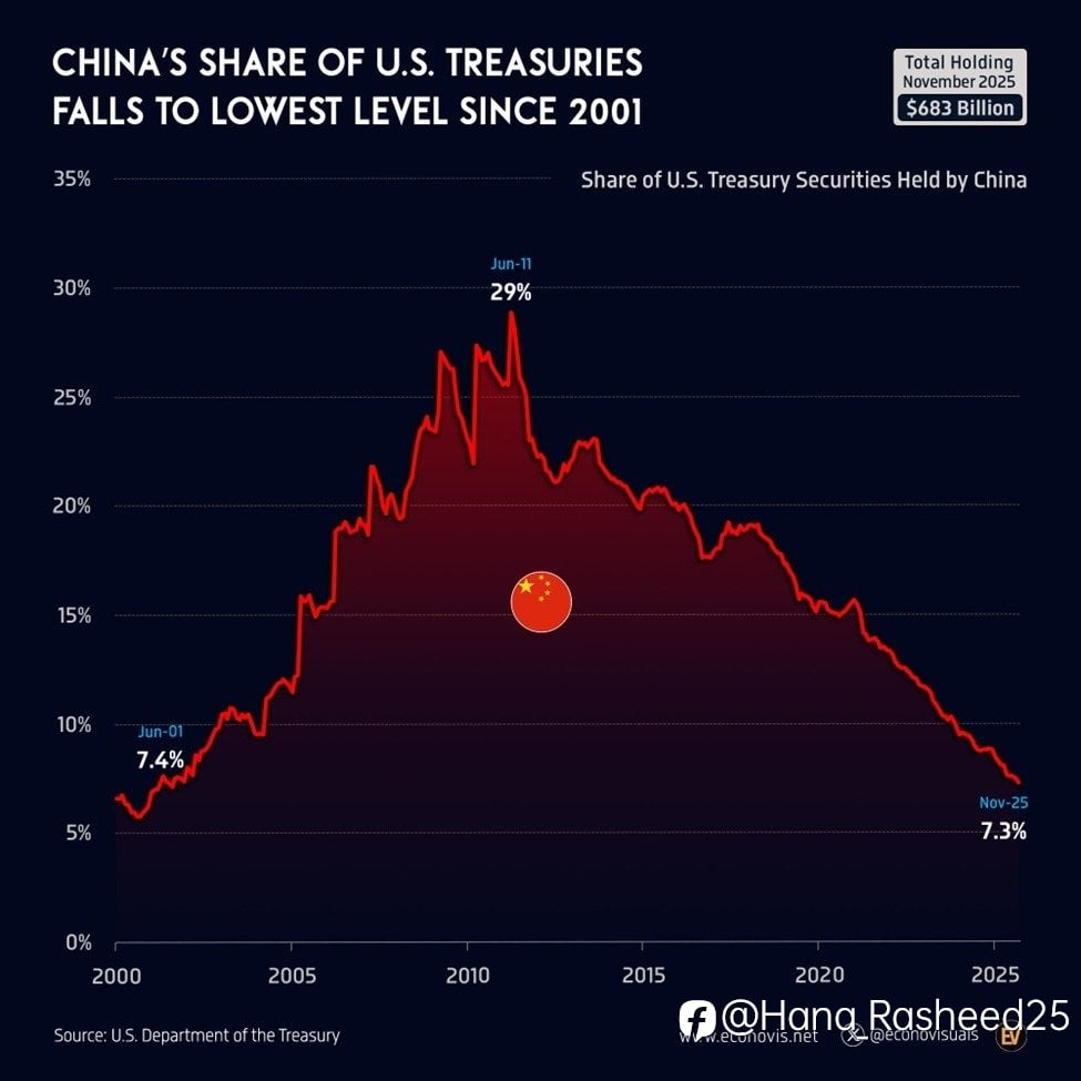 China’s quiet reserve shift? China’s U.S. Treasury share is now 7.3% (lowest since 2001). Holdings down $627B from peak. What does China know that markets don’t?