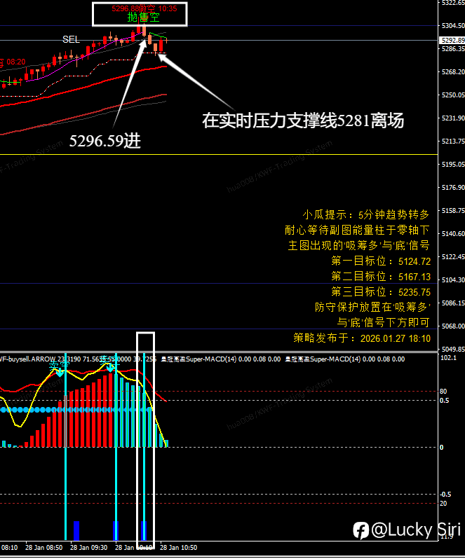 出现信号,从5062.81进-5071离场,拿到8个点,82美金的利润。
