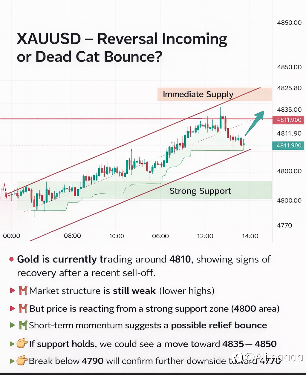Gold is currently trading around 4810, attempting a recovery after a recent pullback. Price is reacting from a key support zone near 4800, showing early signs of a potential bounce. 🔻 Market struct...