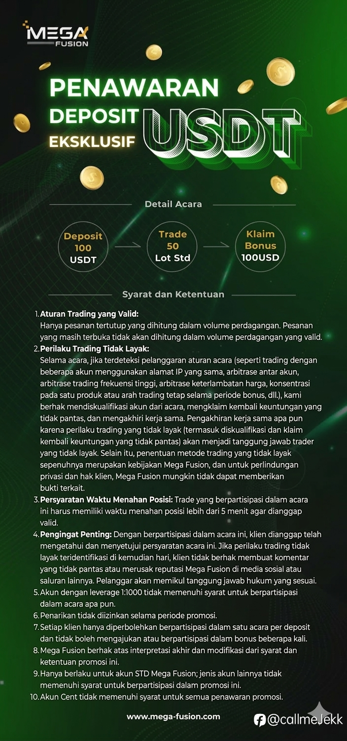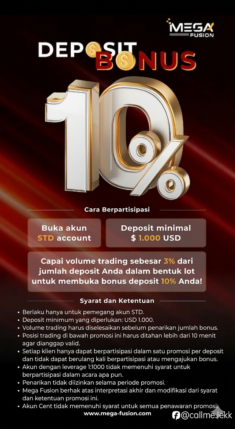 Bonus Deposit 10% dari Mega Fusion! 💰✨ Tambah modal trading kamu dengan bonus eksklusif: 1️⃣ Buka akun STD 2️⃣ Deposit minimal $1,000 USD 3️⃣ Capai target volume trading (3% dari deposit) &...