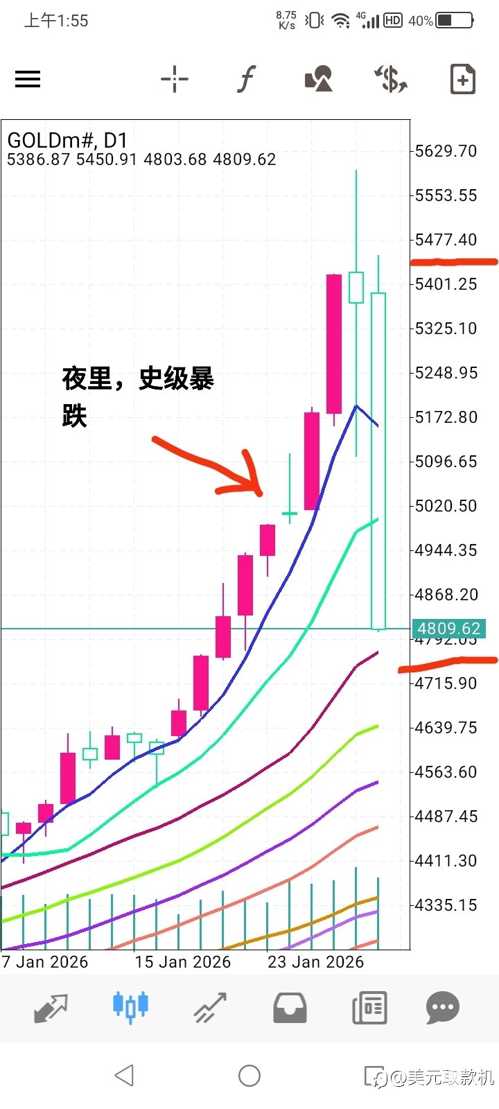 最近在关注黄金,没有关注房市,本以为周四的黄金很疯狂,结果周五晚上的黄金更疯狂,史级记录! 此K线图珍藏!