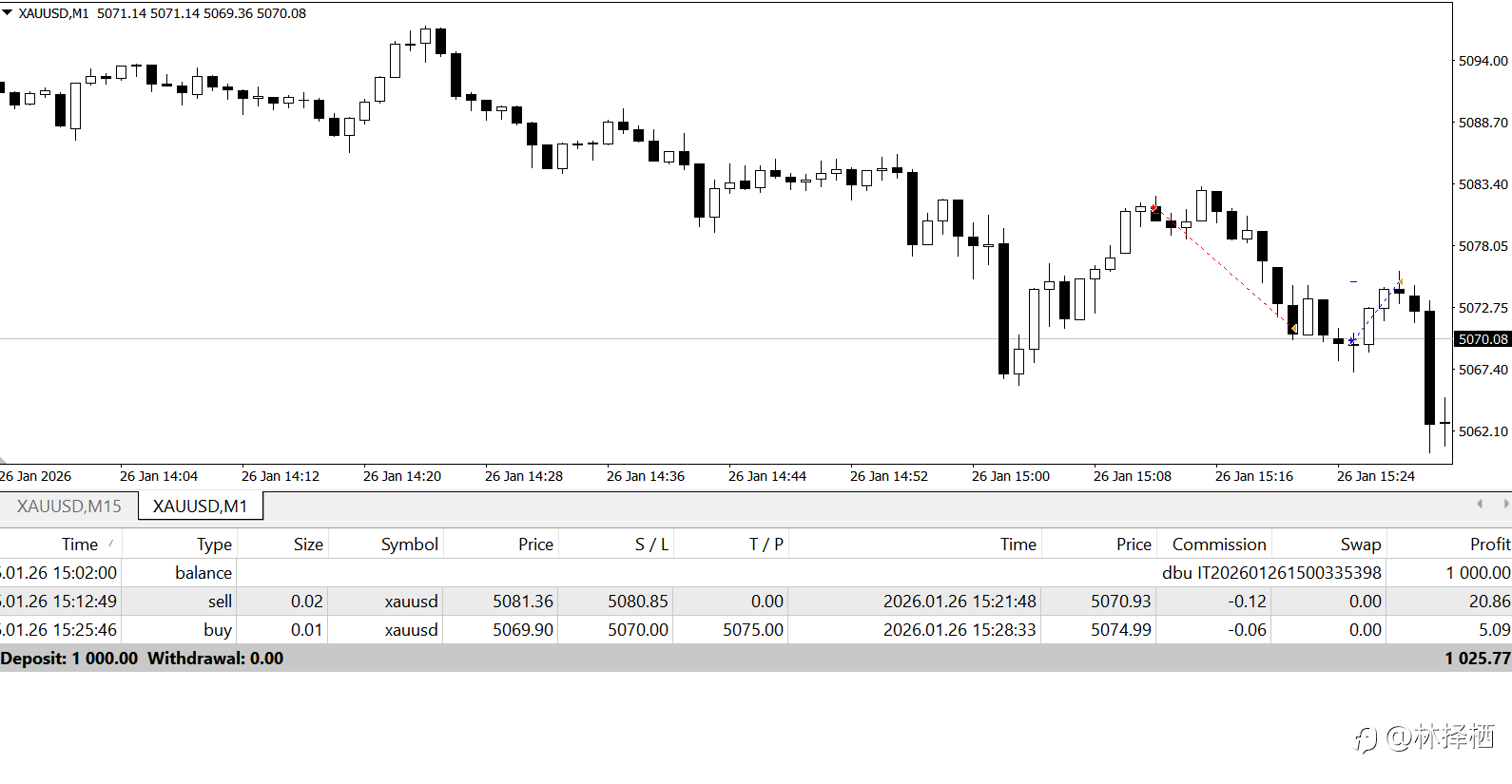 1月26日 2胜0负 +$25.77 今日入金1000美元,目标每天25美元,这样20日能盈利50%,很恐怖的数字了。个人觉得日内交易一个月做不到一个比较高的盈利率,就没什么意义了。所以,尽量做,顺利最好,不顺利时,也就难一点而已。 今天比较容易,不到半小时解决了战斗。第一单一个多小时的平台已经击穿了,M5和M15都出现反弹迹象,进场入没多久就达成了目标。第一单盈利后,第二单就轻松了,下了个0.01的小单子,在斜双底预期下顺利拿到利润,当天目标达成。