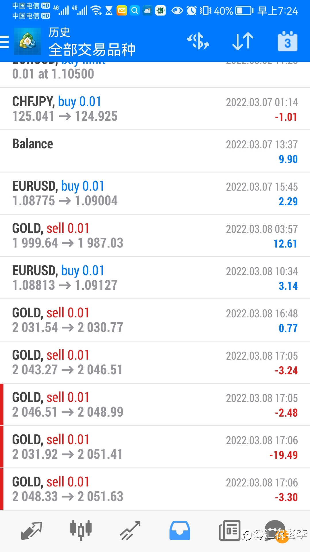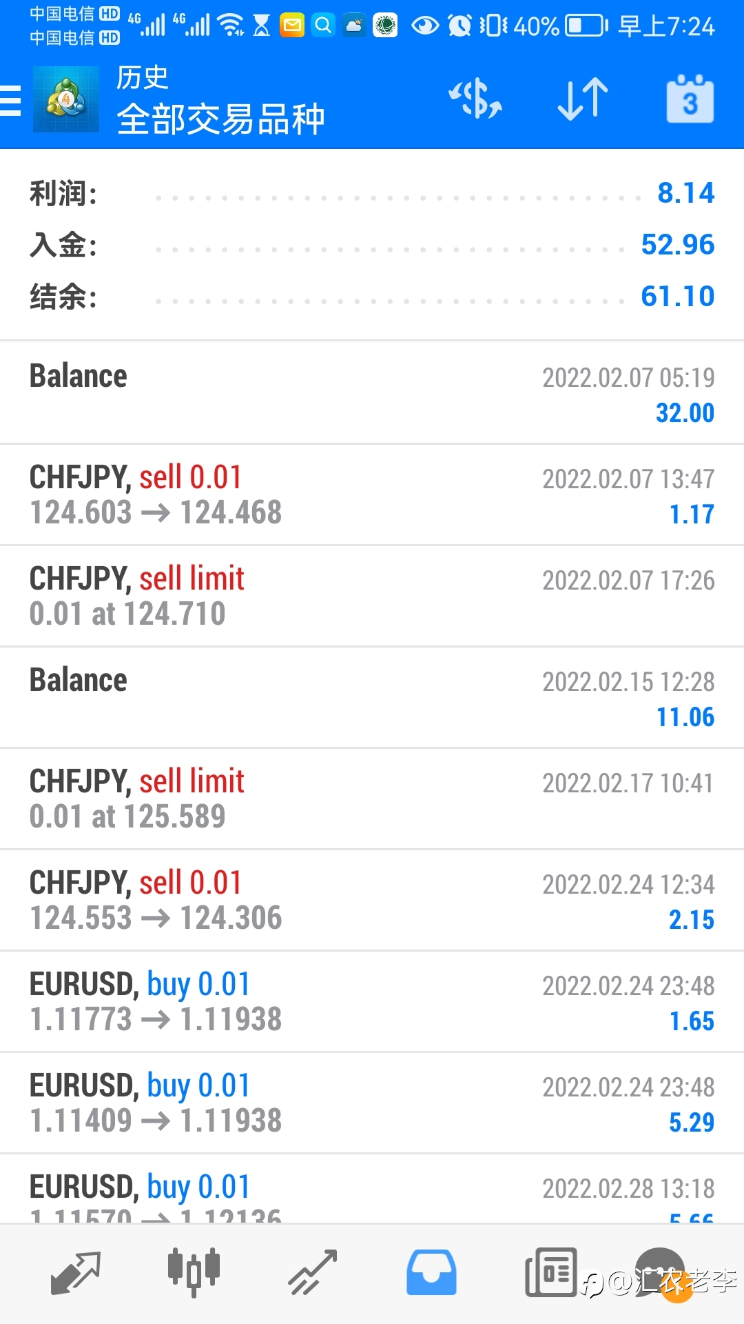 有两位汇友免费订阅了我的信号,可惜信号稀少,他们一位没有等到有下单。一位有一点浮亏就走了,可能是我漂单的手法挺可怕的原因吧。 我的账号很小,不适合订阅,十分抱歉!已经关闭了订阅,不会再出来害人啦😄