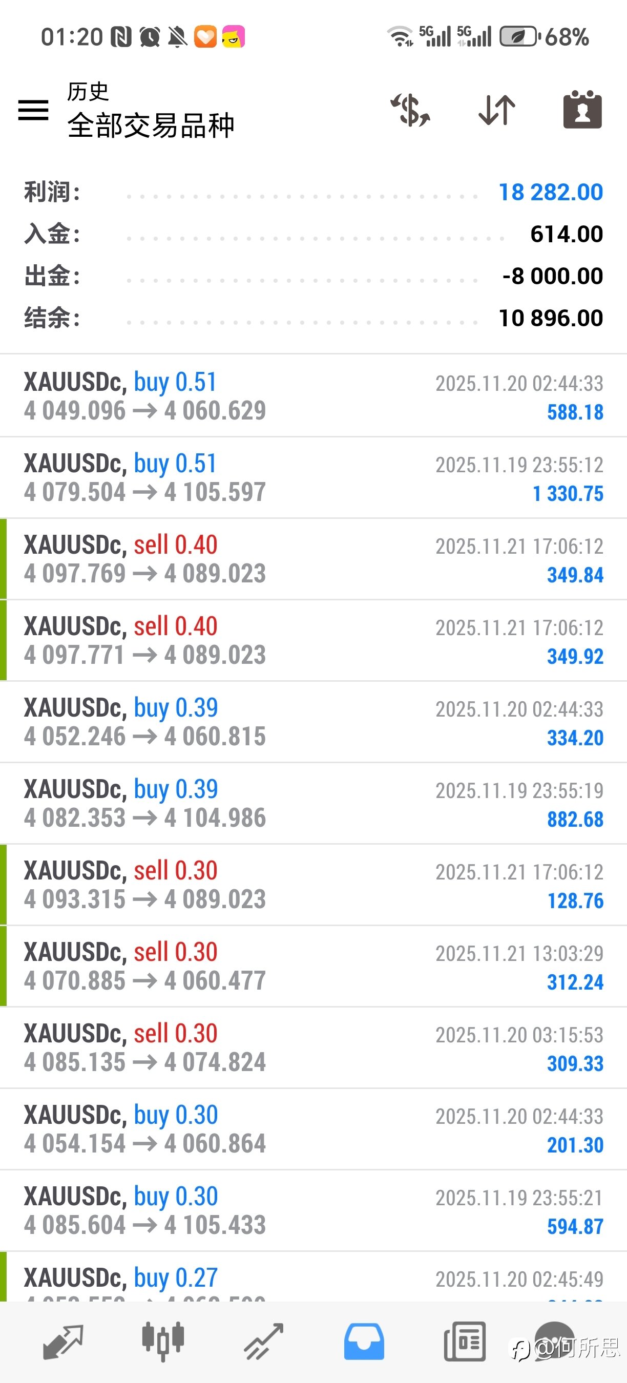 原来的账户从上周五到周六零点,回到了450美金左右(账面310,已转出140)。上周五入金救账户的钱我转到了个新账户,500美金本,比200本的那个账户保守点,只挂了俩EA,一周下来73美金的利润。 这样合计下来,收益差不多回到11月7号左右的样子。 这周行情波动相对较小,如果有超过150美金的上拉或者瀑布行情,200本账户挂四个EA根本扛不住。 现在合计账户净值1000美金出头,想要低风险的每月翻倍,对于马丁而言,对于今年下半年的黄金行情而言,其实非常难。 下面截图是救回来的账户本周的收益,看似200美金一周挣180美金很厉害,其实都是行情赏饭。 &n