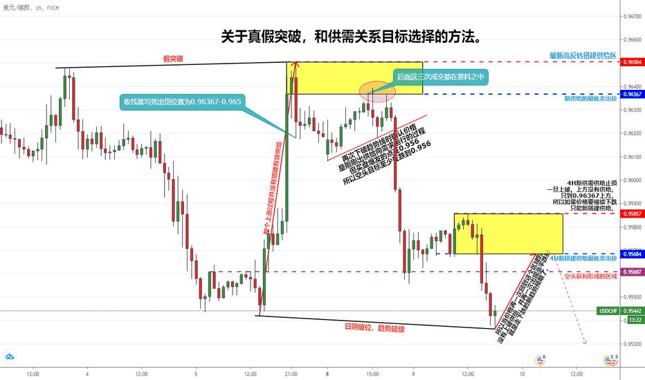关于真假突破,和供需关系目标选择的方法。一、关于突破 1、真突破:价格突破关键点位后必须走横搭建供需求区,并确认这个需求区再向突破方向继续运行方为真突破。 2、假突破:价格突破关键点位后,并不能站稳突破的价格,最后迅速掉头。一般出现反向吞没最为明显有效。或者是非常长的影线。 二、突破的交易方法 1、真突破:当遇到真突破时,必须等当前观察图表的周期收出一根反向K线,这种反向K线为确认K线,一般都会收盘在突破价格之外。当再一次突破高点时回踩进行买入。 2、假突破:当遇到假突破时,价格基本都会出现反向吞没或者非常长的影线,有两种方法入场,第一种用吞没