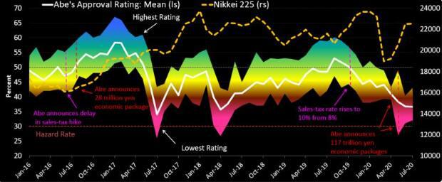 据彭博社报道,日本首相安倍晋三(Shinzo Abe)不断下滑的支持率,增加了日本采取进一步刺激措施,以提振陷入衰退的经济的可能性。 近来,日本民众认为新冠危机应对不尽人意,感染病例又开始上升,对安倍政府的不满也开始集聚。今年12月安倍将迎来第八年首相任期,根据JNN周一发布的一项民调,其支持率跌至创纪录低点35.4%。 彭博社经济学家Yuki Masujima在最近的一份报告中写道,“安倍的支持率已经接近30%的关键水平,从历史来看,这对于一个内阁的寿命来说是一个潜在的危险门槛。经济衰退可能增加采取进一步经济支持措施的可能性”。 “市场预计由于抗疫封锁措施,上季度日本国内生产总值(GD