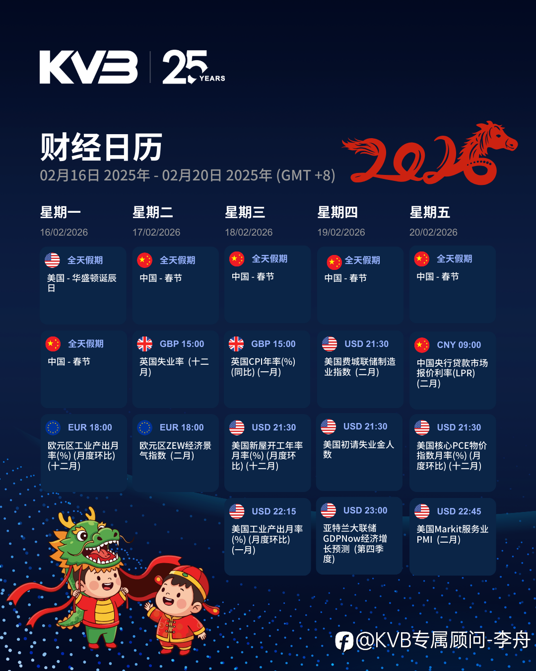 🧧 春节期间市场不打烊 📅下周财经日历 2.16 - 2.20 海外数据照常公布,行情依旧会走。 假期交易注意仓位和风控,别让波动影响心情。 ㊗️ 新年顺顺利利 🧧🧧🧧💰💰💰 🥳🥳🥳