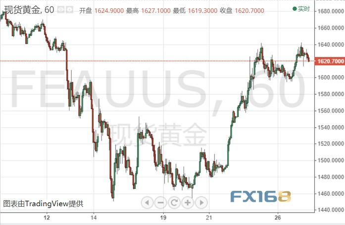 周五(3月27日)亚市盘中,现货黄金位于1621美元/盎司水平交投。日内金价维持自上一交易日高点1643.10美元/盎司以来的回撤之势,目前交投于1621美元/盎司区域。 (现货黄金60分钟图 来源:FX168) 上一交易日金价于亚市早盘开于1615.38美元/盎司,最低下探1595.94美元/盎司,最高涨至1644.00美元/盎司,收于1628.99美元/盎司,下跌13.83美元或0.86%。 与此同时,COMEX 4月黄金期货收涨17.80美元,涨幅1.1%,报1651.20美元/盎司,此前数据显示美国上周初请失业金人数刷新单周历史高位至328.3万。 珀斯铸币局(T