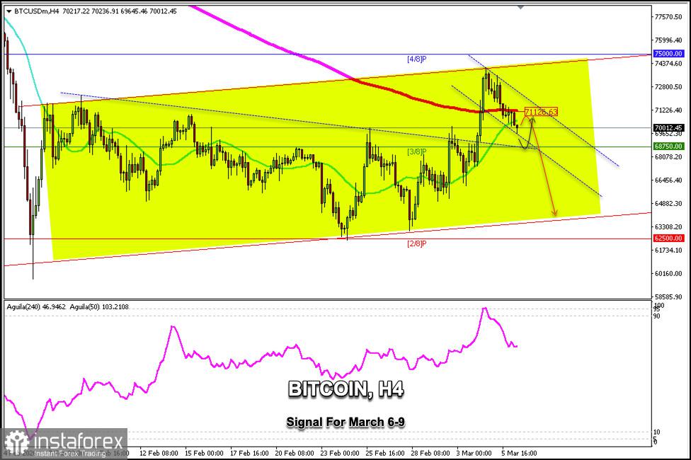 Sinyal Trading untuk Bitcoin (BTC/USD) pada 6–9 Maret 2026: jual di bawah $71.125 (21 SMA - 3/8 Murray)