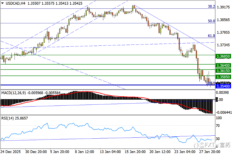 NO.1 美元/日元 (USD/JPY) – 跌势得到懂王“认可”,下看长期升势下轨 日线图看,因特朗普昨夜表态“不担心美元贬值”,美元弱势加剧。美/日再收长阴,不过亚市早盘在24年3-4月狭窄箱顶152.00寻获盘中支撑。即便如此,盘中反弹很快将遭遇去年10月两个波段高点153.30(接近24年套息退潮跌势的61.8%回撤位,多半抛压沉重)。随后在24年11月振荡中枢153.80上方,去年12月双底低位154.40仍是顽阻参考。指标方面,MACD快线在零轴下方加速赶底;RSI触及超卖线后拐头,汇价经历连续下杀后累积一定超跌风险。 4小时图看,美/日超跌状态在短周期指标体现得更为极