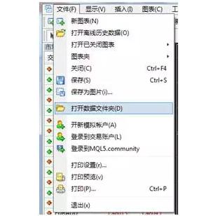 一.如何将一款EA添加进入MT4系统中 添加一款EA是使用外汇EA的第一个简单步骤,虽然相对来说比较简单,但很多刚使用EA的外汇交易者未必能够准确无误的进行,在此作为一个扫盲题放到第一个位置: 首先,我们需要打开MT4然后点击左上方的文件,弹出下拉式菜单,选择“打开数据文件夹”如下图: 找到“MQL4”文件夹双击进入,之后再找到“Experts”文件夹,将我们所需要的EA拷贝到这个文件夹里面: 将需要使用的EA放到Experts文件夹 回到平台,左侧导航列表(导航列表可以在上方显示账户信息按钮左边找到),在EA交易位置右键刷新,则可以找到新添加的EA程序: 二.如何开启运行MT4 EA