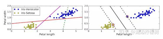 一、简介 支持向量机(SVM)是个非常强大并且有多种功能的机器学习模型,能够做线性或者非线性的分类,回归,甚至异常值检测。机器学习领域中最为流行的模型之一,是任何学习机器学习的人必备的工具。SVM 特别适合应用于复杂但中小规模数据集的分类问题。 本章节将阐述支持向量机的核心概念,怎么使用这个强大的模型,以及它是如何工作的。 二、线性支持向量机分类 SVM 的基本思想能够用一些图片来解释得很好,图 5-1 展示了我们在第4章结尾处介绍的鸢尾花数据集的一部分。这两个种类能够被非常清晰,非常容易的用一条直线分开(即线性可分的)。左边的图显示了三种可能的线性分类器的判定边界。其中用虚线表示的线性模型判