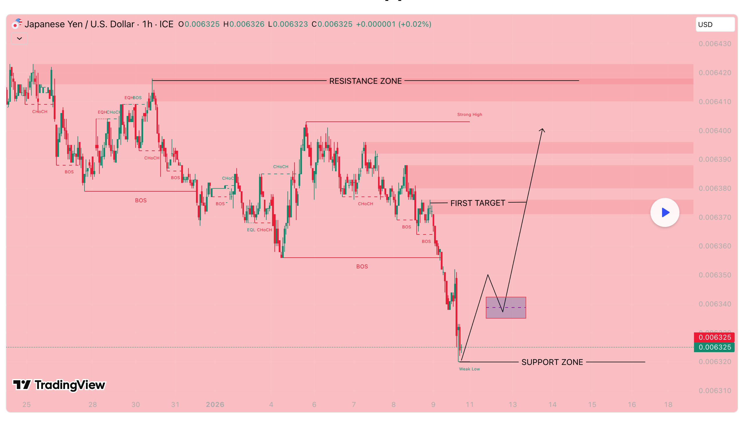 JPY/USD đang giao dịch trong cấu trúc thị trường giảm rõ rệt trên khung thời gian 1 giờ, với nhiều tín hiệu BOS (Break of Structure – phá vỡ cấu trúc) và CHoCH (Change of Character – thay đổi tính chất xu hướng) xác nhận &aacu