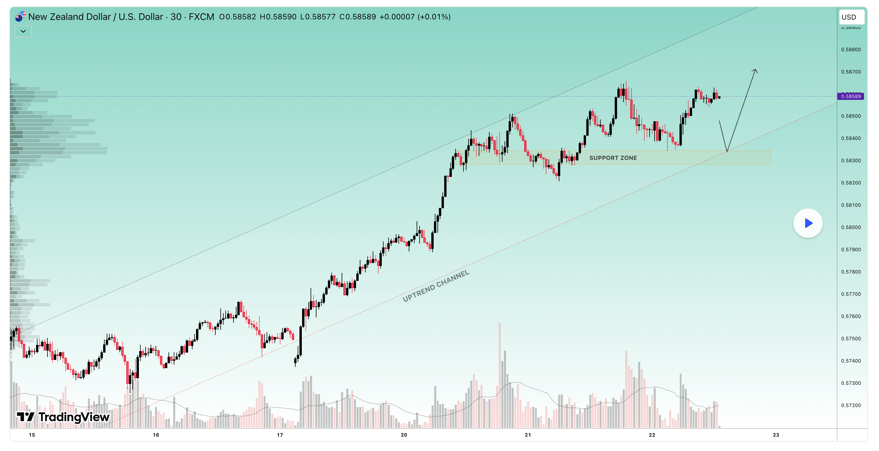 NZDUSD đang giao dịch trong một kênh xu hướng tăng rõ ràng và hiện đang điều chỉnh giảm vào vùng hỗ trợ mạnh. Sự điều chỉnh này dường như mang tính điều chỉnh, và cấu trúc thị trường tổng thể vẫn lạc quan. Miễn là giá