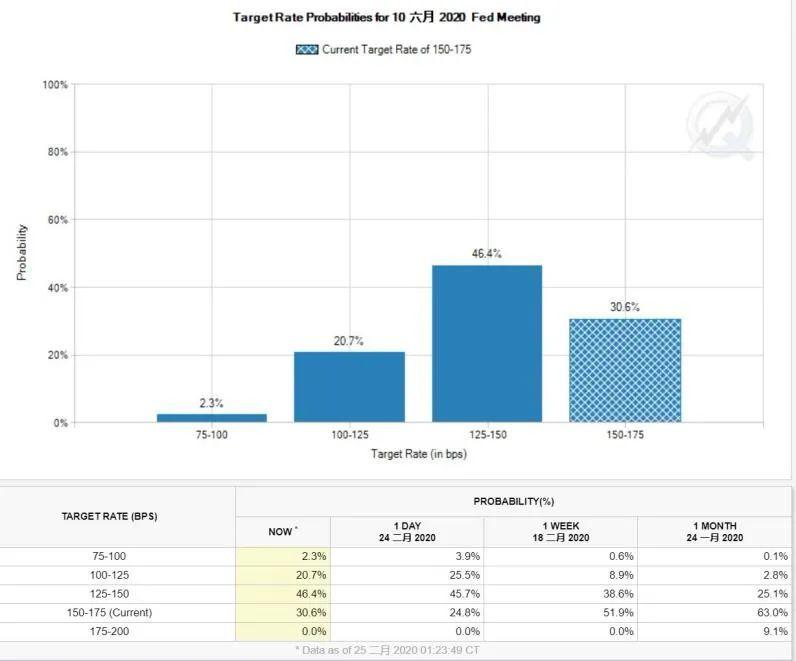 随着黑天鹅事件向全球蔓延,交易员对全球央行降息的押注也在加重。市场预计美联储年内将出现两次降息,而全球其他央行也有望效仿。 美联储降息预期升温 2月25日,市场预期美联储6月降息25个基点的概率达到46.4%,而上个月仅为25.1%。此外,12月降息25个基点的概率达到32.4%,而上个月仅为21.9%。 受降息预期推动,资本市场纷纷作出反应。美元指数本周继续下挫,最低触及99.1108;在国债市场上,通常被视为增长预期指标的30年期国债收益率一度下挫至历史低点1.841%。而反应对美联储政策期望的2年期国债收益率则下行至2017年以来的低位1.276%。