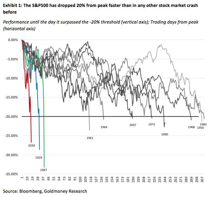 过去这一周,足以载入史册。 美股以最快速度跌入熊市、债券丧失避险功能、市场波动性急剧放大……市场上举目四望没有任何安全港,全球资产都在下跌。 此次跌入熊市的速度史上最快。标普500指数从高点下挫20%的速度不仅快于上一次金融海啸期间的2007年,甚至快过1987年股灾和1929年的大萧条。 本周,美国债券市场的振幅也是前所未有的,美国30年期国债收益率振幅甚至超过1%: 单日来看,本周有两天标普500跌幅进入美股历史前20,其中12日9.51%的跌幅排进了第五;周五也就是13日的强劲反弹也创下史上第十大反弹幅度。 01 没钱了!没钱了!真的没钱了! 市场流动性告急! 反映市场流动
