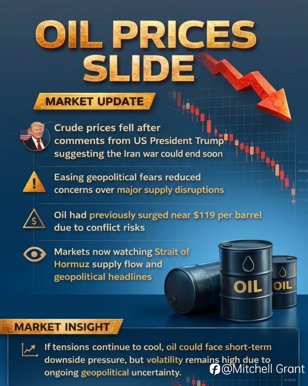 🛢️ Oil prices slide as comments from Donald Trump hint at a possible end to the Iran conflict, easing supply fears in global markets. 📉