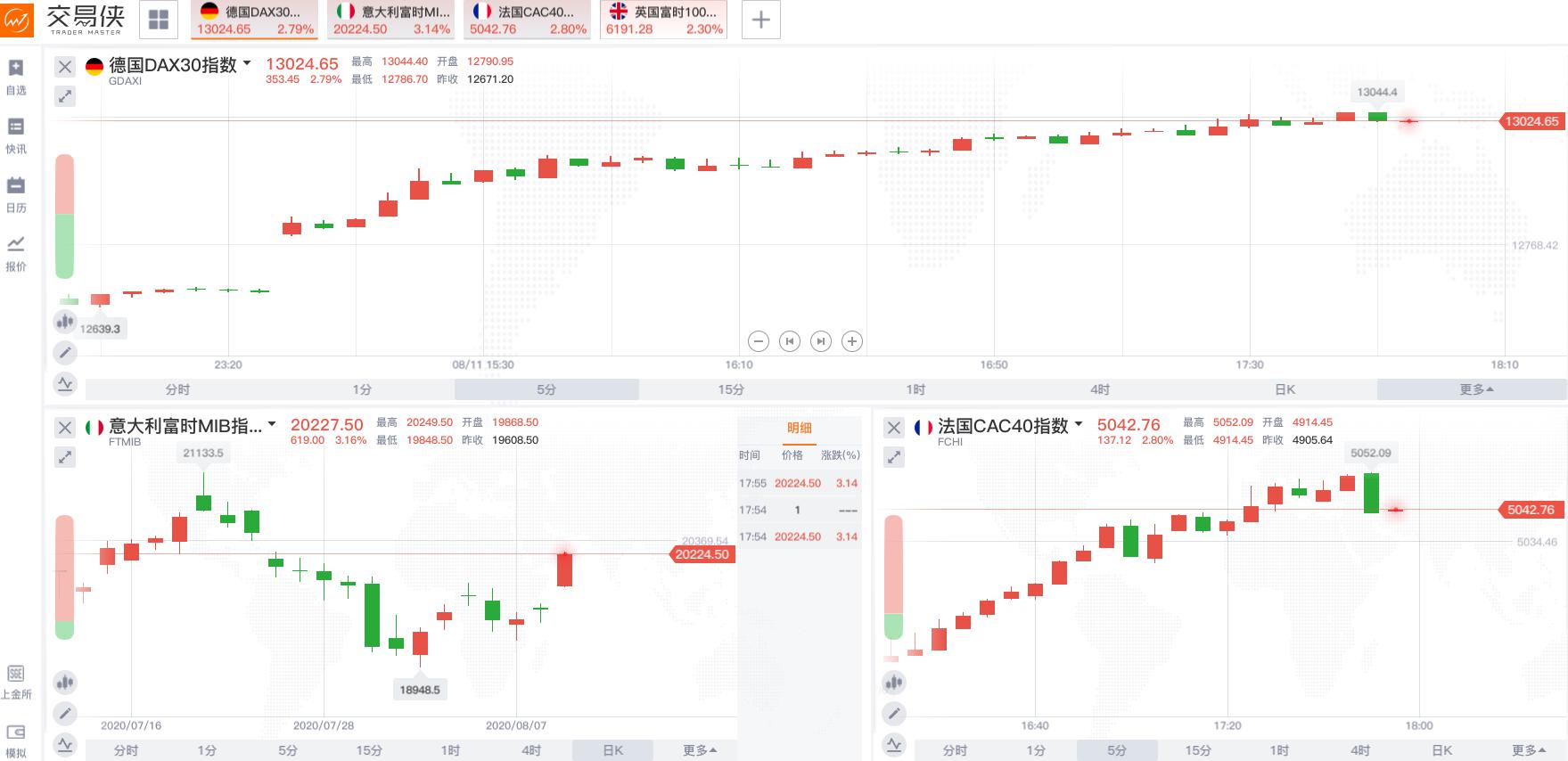 北京时间8月11日欧盘时段,欧股高开高走,后涨幅进一步扩大至3%,意大利富时MIB指数涨幅达3%,德国DAX指数涨近2.8%,法国CAC40指数涨近2.9%。与此同时,美股三大股指期货进一步拉升,道指期货涨超1%,标普500指数期货涨0.7%,纳指期货涨0.65%。 德国8月ZEW经济景气指数录得71.5,大幅好于预期的58和前值的59.3,德国智库ZEW表示,经济迅速复苏的希望继续增加。欧元区8月ZEW经济景气指数录得64,高于前值的59.6。这提振了市场的风险情绪,现货黄金欧盘时段持续走低,一度跌至1983美元的低位。提振市场风险情绪的另一个重要因素是俄罗斯疫苗最新的重大进展。据俄新社等多