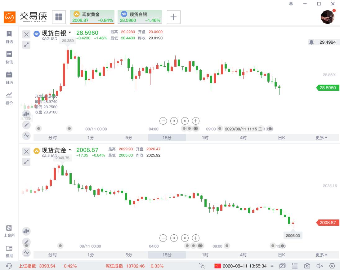 周二下午,现货黄金持续下挫,最低跌至2002美元/盎司,刷新近一周低位。后跌幅进一步扩大,下破2000大关之后黄金加速下跌,一度跌破1990美元/盎司,日内跌超1.7%,跌幅近40美元。这是8月4日黄金上破2000大关以来首次跌破该关口,后市恐继续在此关口附近胶着。 现货白银日内重挫4.00%,现报27.86美元/盎司。COMEX期银重挫,日内跌4.03%,现报28美元/盎司。 A股贵金属板块持续走低,赤峰黄金逼近跌停,盛达资源、恒邦股份等跟随下挫。 对于这波回调,分析师指出: 首先,资产价格走势在任何方向上都不会是直线移动的,连日猛涨后的回调是必要的。黄金的上行轨迹迟早会出