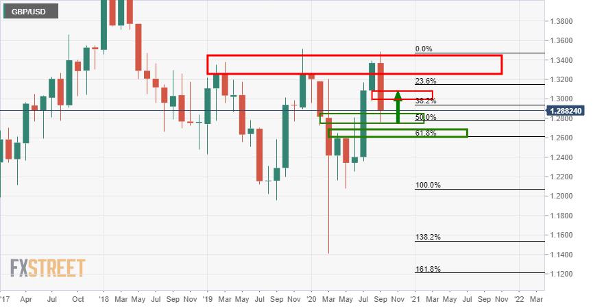 GBP/USD is embarking on a correction towards a 38.2% Fibonacci of the September bearish impulse. This gives rise to a downside extension in a 1,2,3 setup. The market is a potential fade on rallies and from a top-down analysis, a potential sell limit setup is illustrated in the following flow of ch