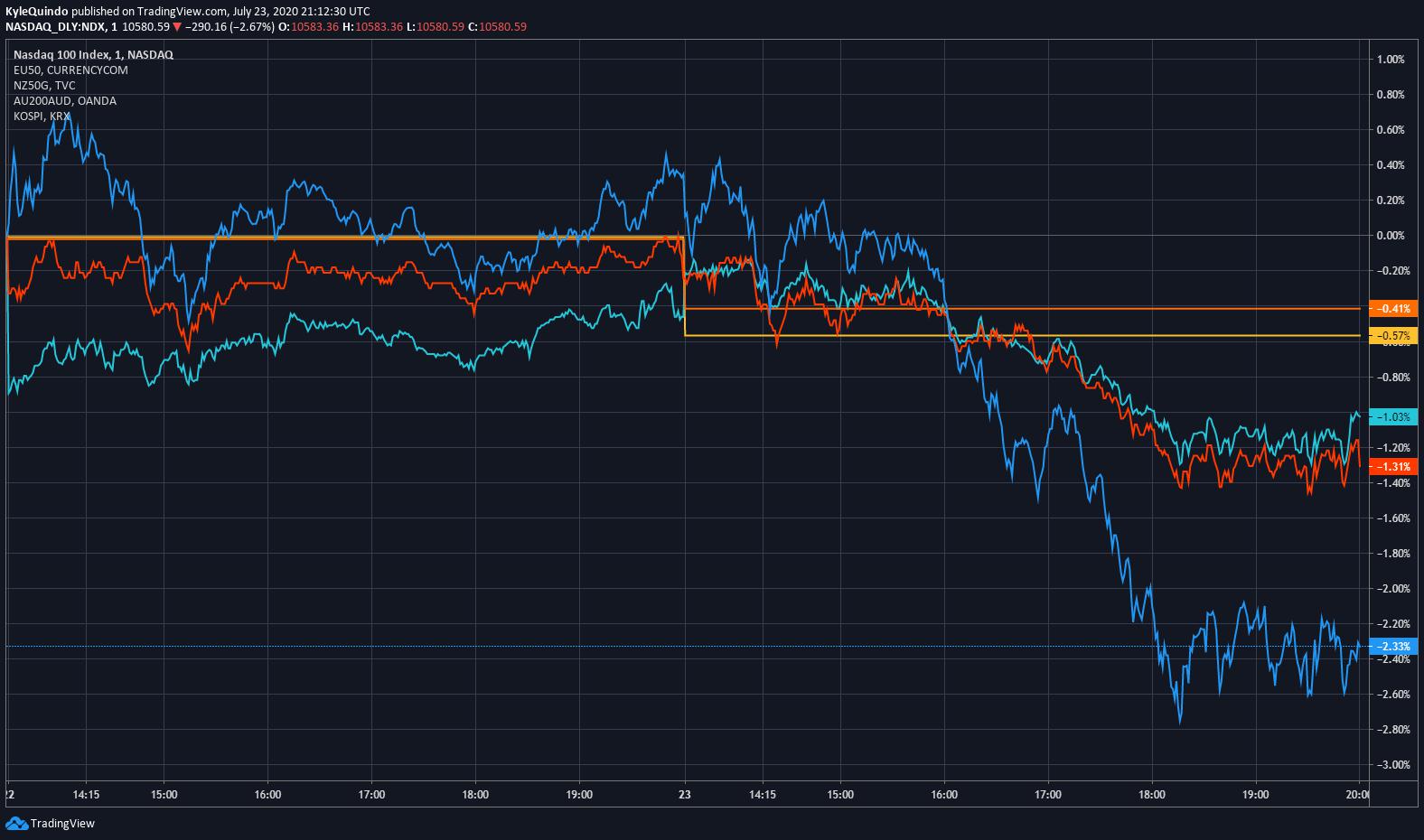 NASDAQ down 2% on Coronavirus fears Tech and consumer equities lead the charge downwards as fears that the recovery has stalled in the US emerges. The NASDAQ is down 2.33% today, with the SP500 and Dow Jones down 0.66% and 0.7%. Priced-to-perfection tech stocks, even with better than expected earnin