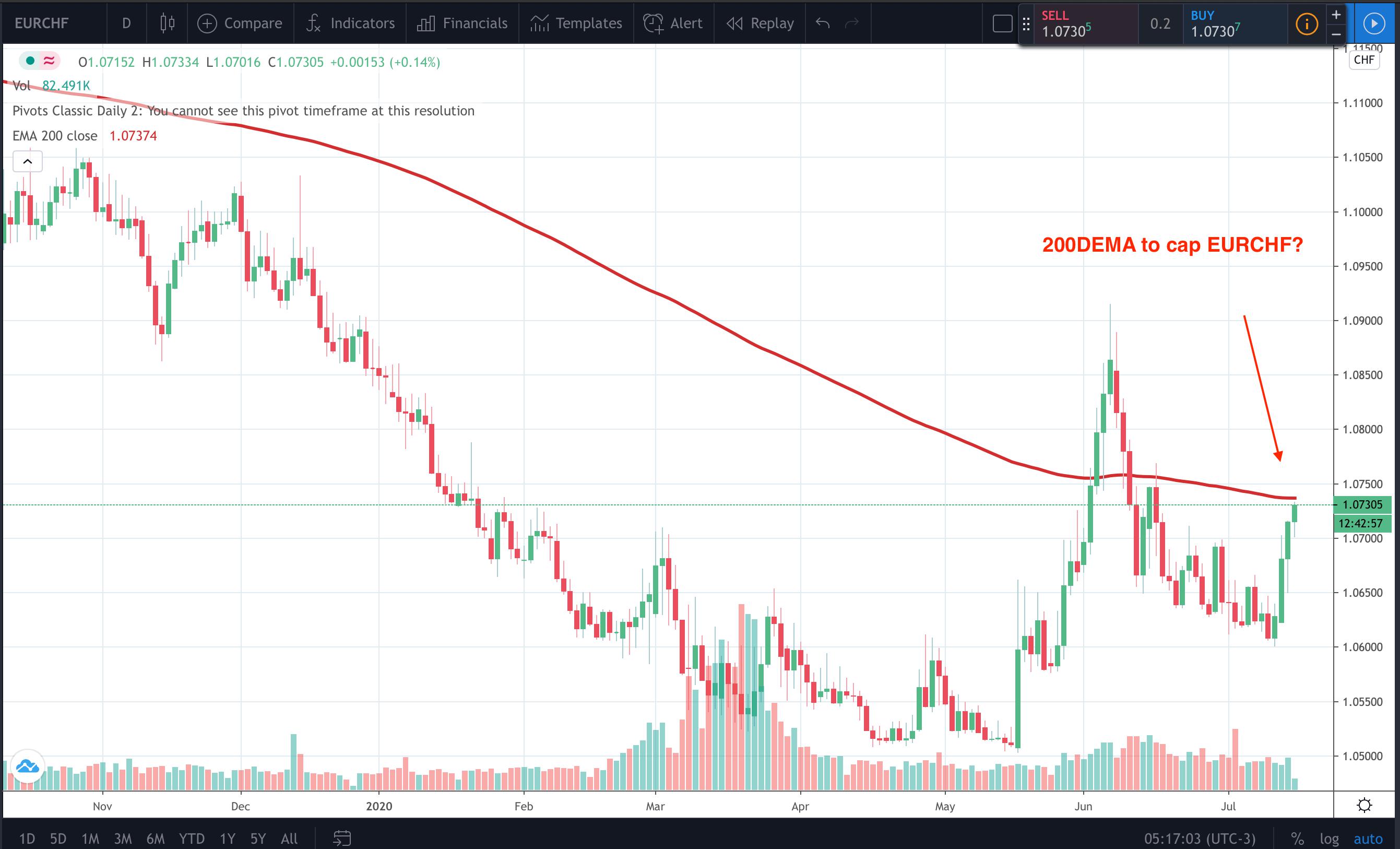 CHF weakness to fade? EURCHF has gained recently on two factors. Firstly, the improving risk tone. Secondly, on the hopes of the €750billion recovery fund being agreed over the weekend. This has led to the EURCHF pair rising above 1.0700 handle and now heading testing the 200DEMA marked on the chart