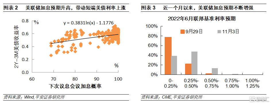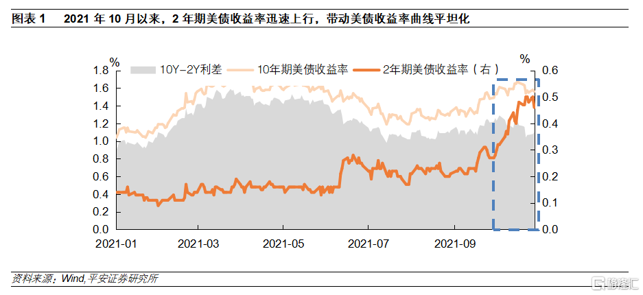 摘要:美债收益率曲线的平坦化可能只是一个开始 核心摘要 2021年9月末以来,短端美债收益率迅速攀升,而长期限美债收益率变化并不明显,美债收益率曲线再度平坦化。 1、短端美债利率开始反映加息预期。1、根据芝商所联储观察工具对于明年6月联邦基准利率的预测,9月末仍有76.9%的概率认为明年6月不会加息,而10月末这一概率大幅下降至33.6%。2、美联储对于通胀态度的转变是市场加息预期增强的“导火索”。在今年8月末举行的全球央行会议上,美联储主席鲍威尔还表示,近期高企的通胀只是由一些“暂时性因素”引起。但就在一个月之后,鲍威尔对于通胀的态度却发生了巨大转变,他不仅表示供应链瓶颈使得通胀上行压力增加