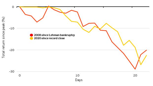 冠状病毒的爆发将对经济造成剧烈而深刻的冲击——类似于一场大规模的自然灾害。市场一直在为经济影响而焦虑不安,这一点从2008年全球金融危机的一些举动就可以看出。 但我们认为今天是不同的。为抗击疫情而采取的社会疏离措施将大幅减少经济活动,但只要各国政府拿出果断而全面的财政和货币政策应对措施,这场冲击就不应从根本上破坏全球经济。 发达市场股市自2月份见顶以来下跌了27%,但在上周五收盘前大幅收窄跌幅。抛售的规模与2008年雷曼兄弟破产后的情形类似。 见上图。市场波动性也大幅上升,衡量美国股市隐含波动率的VIX指数飙升至全球金融危机以来的最高水平。固定收益类股也大幅波动,美国国债收益率本周先是触及纪