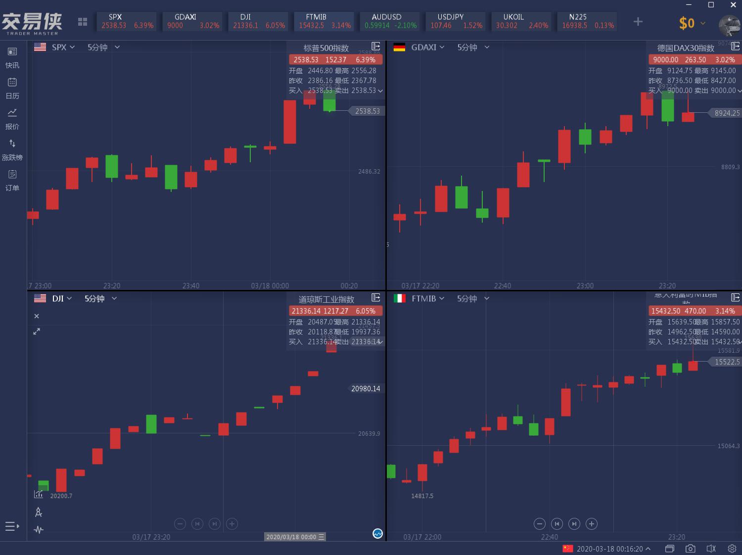 周四(3月17日)美股盘中,各类资产明显反弹! 美股持续拉升,截止周五凌晨00:14,道指涨超千点,涨超5%,纳指和标普500指数涨超7%。 欧股盘中同样大涨,欧洲斯托克600指数扩大涨幅至2.7%。欧洲斯托克50指数一度涨3.04%,西班牙IBEX35指数涨5%,意大利富时MIB指数涨3.17%。富时中国A50指数期货日内涨幅超1%。 现货黄金持续拉升,一度站上1550美元/盎司,较日低反弹近85美元;现货白银一度收复13美元/盎司关口,日内涨近1.7%;现货铂金涨逾6%,报706.69美元/盎司。 原油短线走高。 纽约联储宣布美联储周二将进行额外的隔夜回购操作,最高5000亿美元