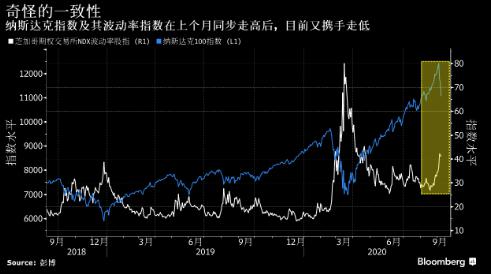 在科技股出现六个月来最大跌幅的当天,衡量相同一批股票波动率的一个指标表现奇怪:该指标也走低了。 纳斯达克100指数当天下跌4.8%,三天回调幅度达到11%。与此同时,衡量该指数波动率、同时也是部分反映期权价格的一个指标也下跌了,这两个指数出现相同走势的情况现在已经持续了两周。通常,这两个指数会朝相反的方向波动,因为股票下跌支撑了对未来走势坎坷的预期。 两个指数罕见地携手走低进一步表明了衍生品市场上的异常持仓情况。该市场中的投机和对冲都达到了极限,而大机构则让大规模的资金离场观望。正如过去一周所报告的那样,散户和机构投资者都增持看涨期权合约,押注股市将会上涨。随着纳斯达克指数大幅下跌,人们对上