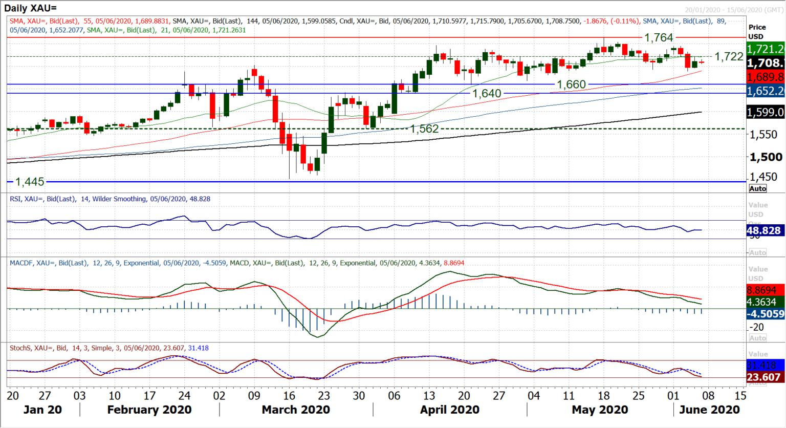 Gold Following the breakdown of the 8 week uptrend and the support at $1693 we turned neutral on gold. Noting that the bulls are no longer in control, we see that upside traction is difficult to sustain and in the past couple of weeks the negative candles are more of a dominant force on the daily ch