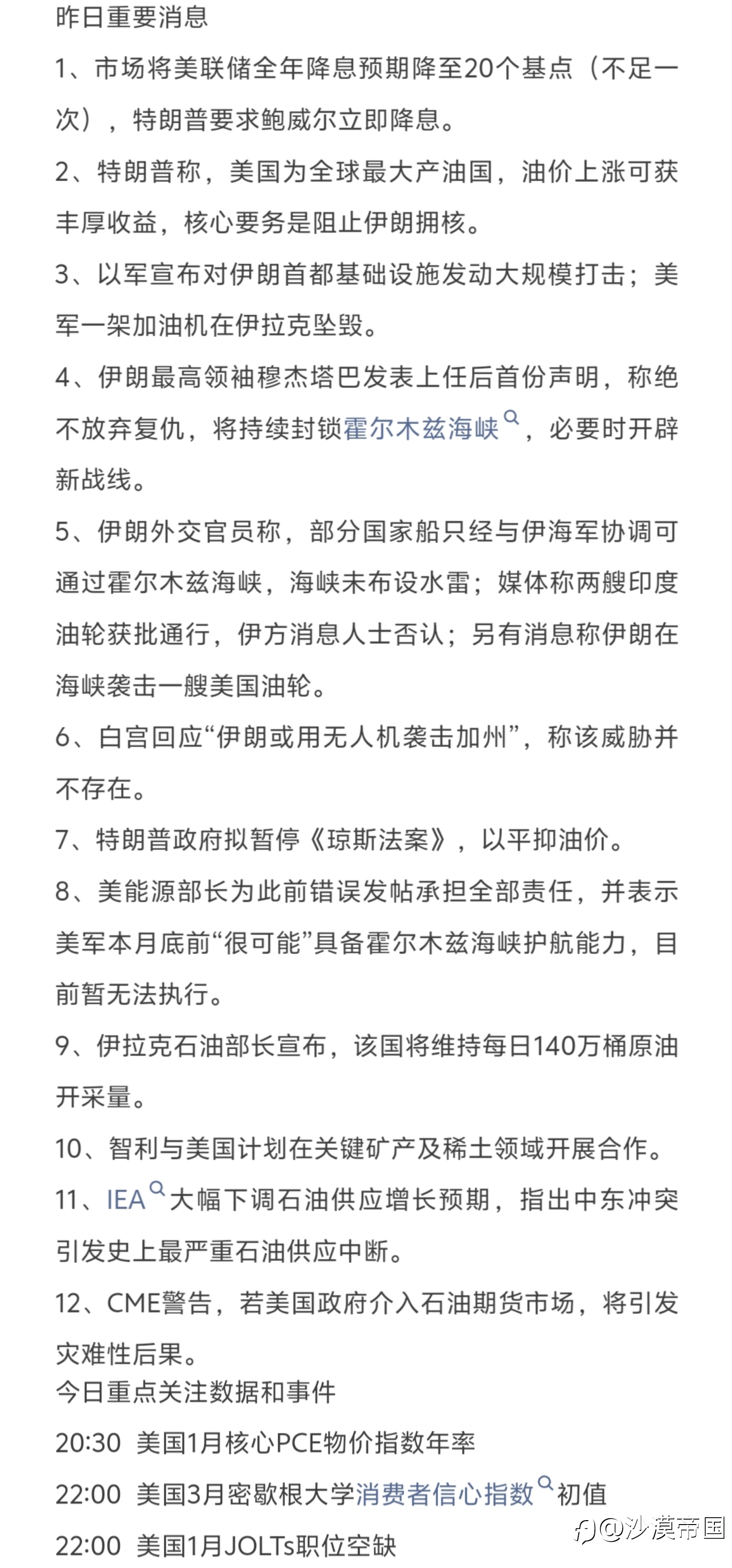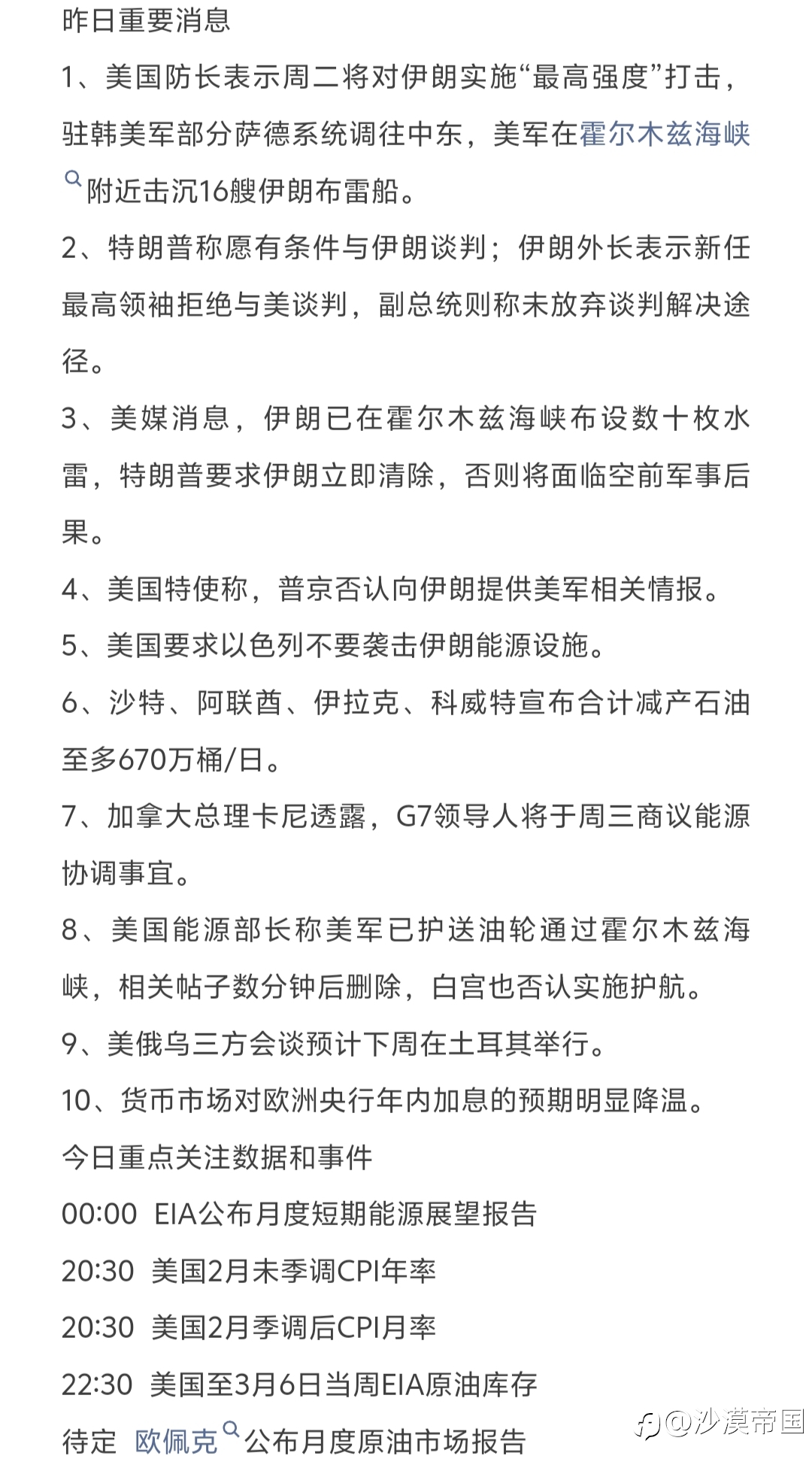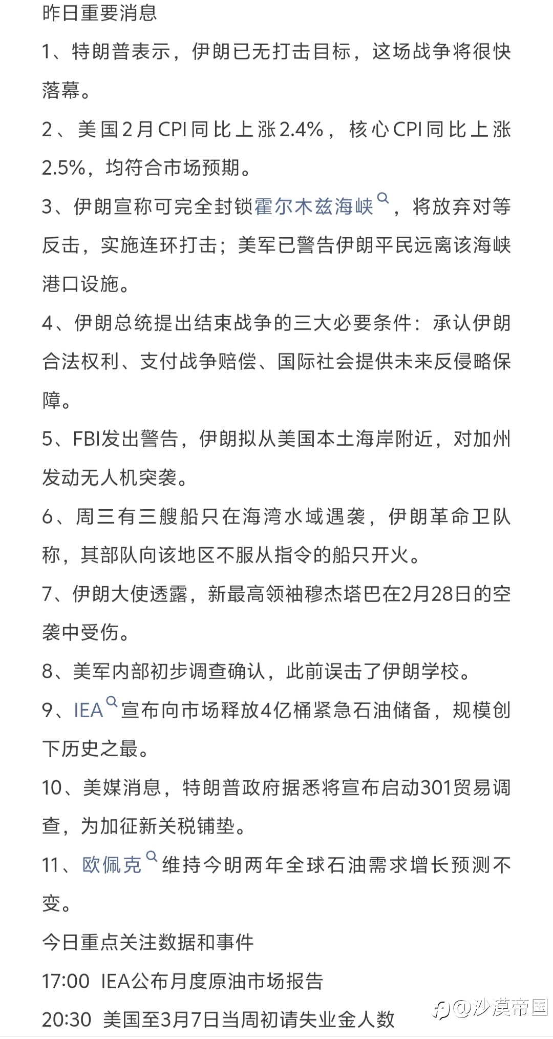今日重点关注的财经数据与事件:2026年3月11日 周三 ① 待定 欧佩克公布月度原油市场报告 ② 15:00 德国2月CPI月率终值 ③ 20:30 美国2月未季调CPI年率 ④ 20:30 美国2月季调后CPI月率 ⑤ 20:30 美国2月季调后核心CP...
