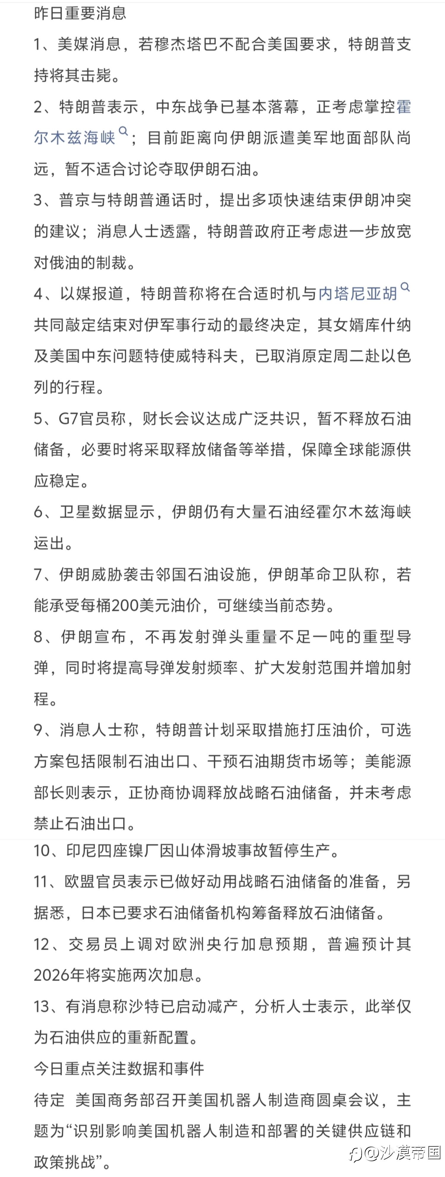 今日重点关注的财经数据与事件:2026年3月10日 周二 ① 待定 中国1-2月贸易帐 ② 待定 美商务部召开机器人制造商圆桌会议 ③ 15:00 德国1月季调后贸易帐 ④ 15:45 法国1月贸易帐 ⑤ 18:00 美国2月NFIB小型企业信心指...