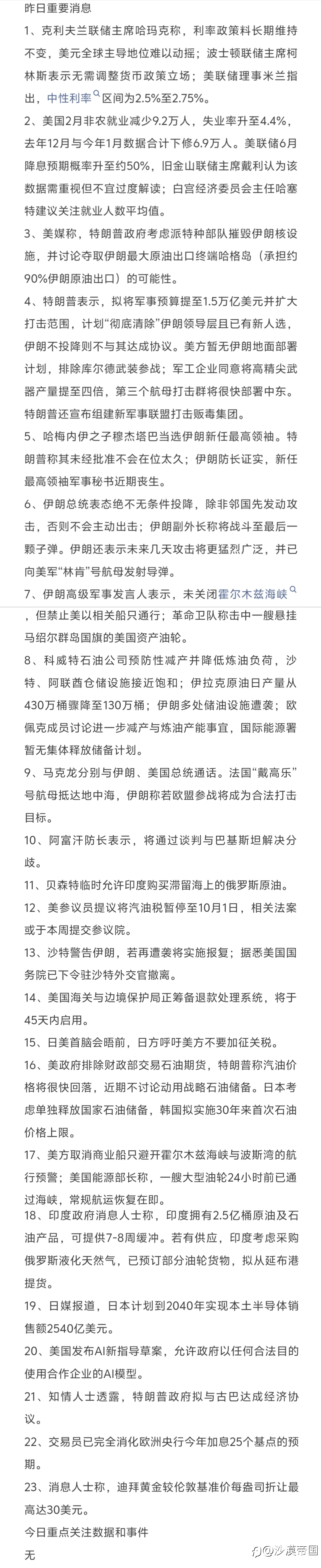 今日重点关注的财经数据与事件:2026年3月9日 周一 ① 待定 国内成品油开启新一轮调价窗口 ② 待定 欧盟与中东领导人举行视频会议 ③ 07:50 日本1月贸易帐 ④ 09:30 中国2月CPI年率 ⑤ 15:00 德国1月季调后工业产出...