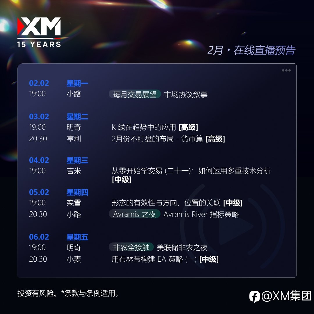 📢 黄金行情持续不减,波动背后暗藏哪些交易机会?趋势是否正在酝酿新一轮方向选择? 🔥 每周一至周五,1小时+实战教学, XM陪你紧贴市场节奏,拆解交易逻辑,掌握实用策略与高效出场技巧,全面提升交易稳定度与胜率! 🌟 本周重点推荐 ——【非农全接触】美联储非农之夜 。迈入2026年,美联储话题不断,开年密集释放的宏观信号,将如何影响即将到来的非农数据?明奇老师将带你一起分析非农前后的市场结构,理清全年后续阶段的关键投资主线。 🎯 锁定直播,从宏观解读到实盘思路,系统提升你的交易认知与执行力! 🎯 XM本周直播课程亮点 【每月交易展望】市场