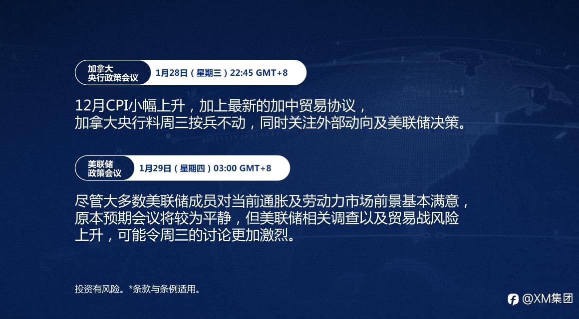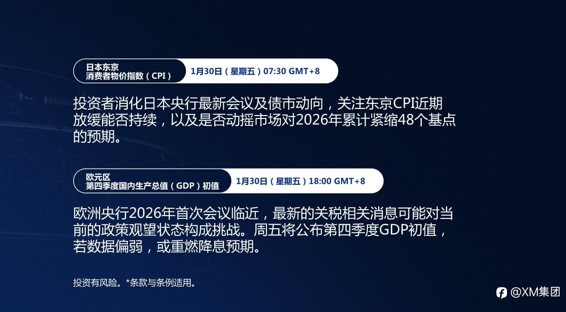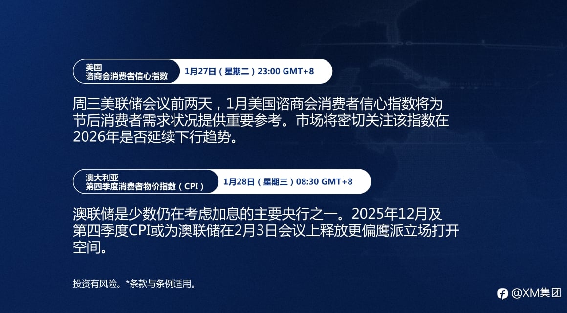 本周最值得关注的重大事件: 本周经济日程包括美国消费者信心指数、东京与澳大利亚CPI数据,以及2026年首次加拿大央行会议。但投资者焦点仍在美联储政策会议和欧元区2025年第四季度GDP初值。 掌握市场动态。点击此处,查看完整经济日历: