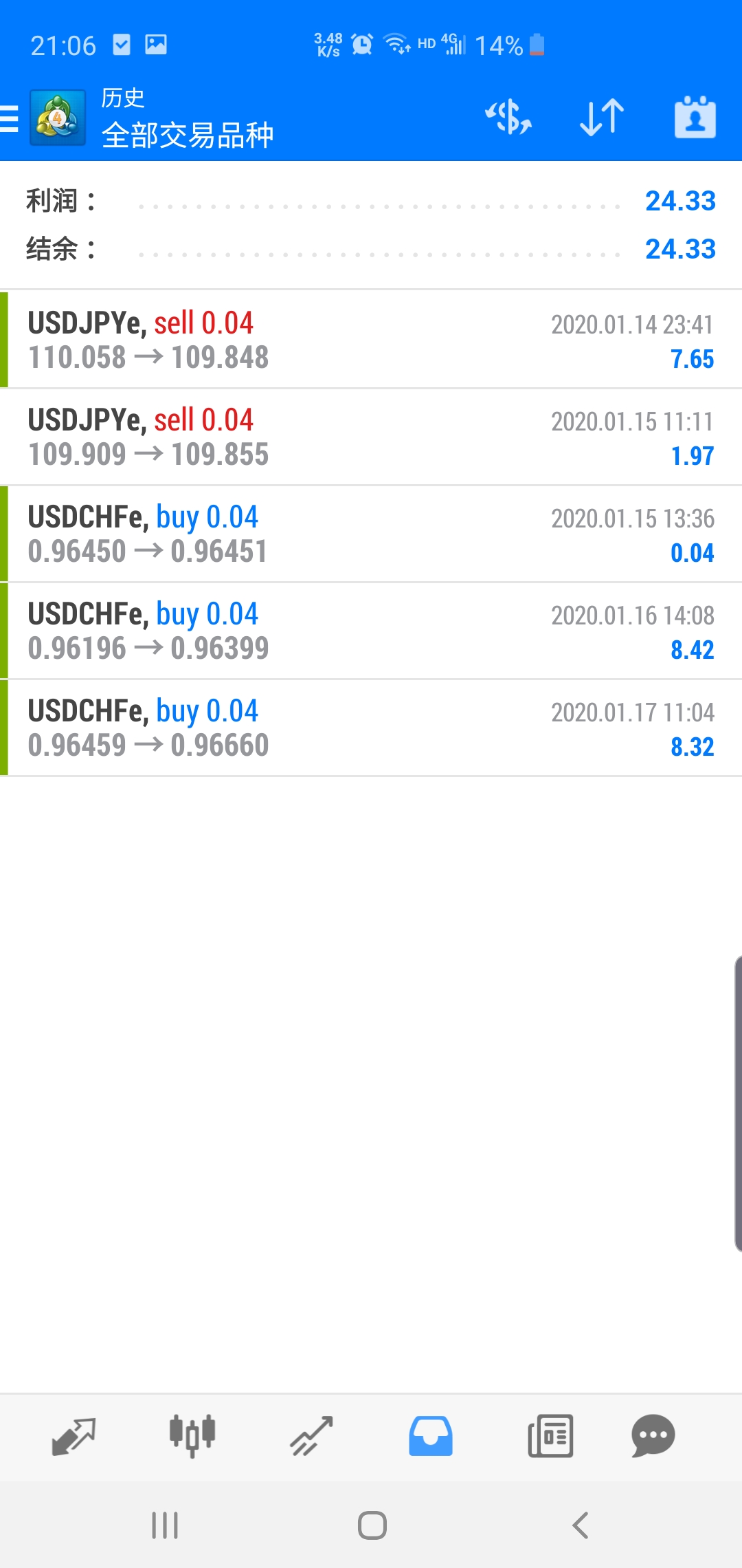 百元散户账户,每天虽然挣得不多,但是每天都有收益,账户开通5个交易日,每天都有盈利,欢迎广大汇友继续关注,最小交易0.01手,最大交易0.02手,主要做外汇货币。