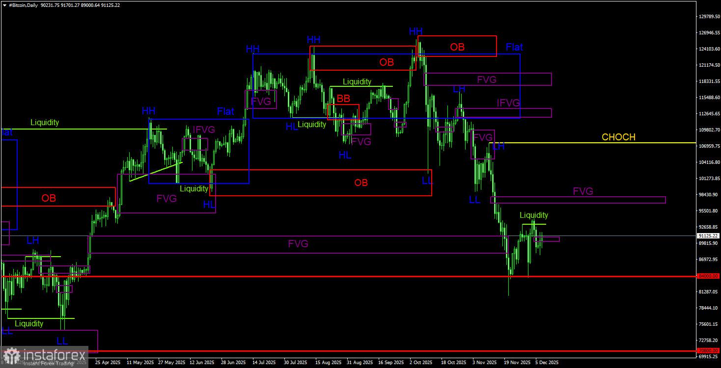 Bitcoin terus mengalami koreksi. Gambaran teknikal saat ini cukup jelas, tetapi pola kemarin agak memperumit situasi. Ini merujuk pada FVG bearish pada time frame harian, yang bertentangan dengan gambaran teknikal pada time frame 4 jam dan semua pola yang ada. Oleh karena itu, saya harus merujuk pad
