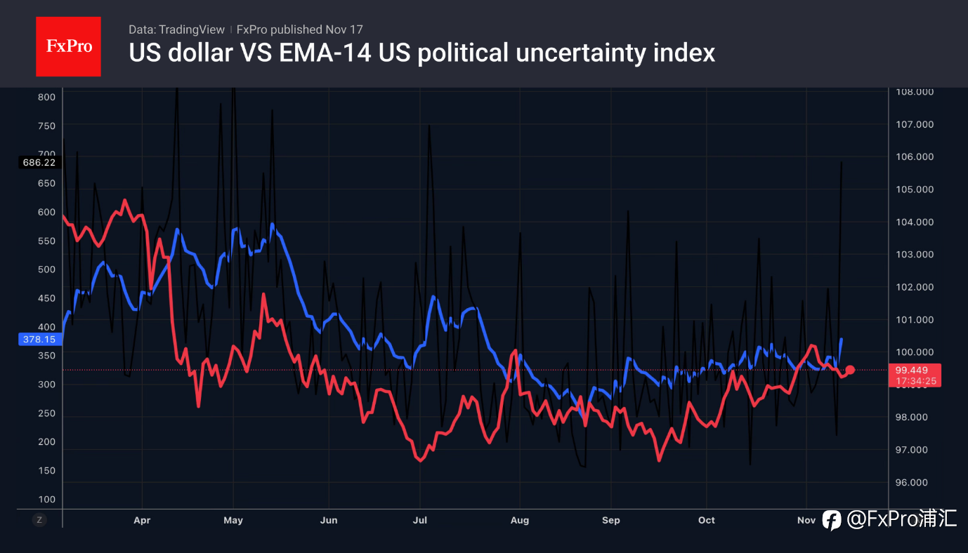 注:此文章由FxPro高级分析师Alex Kuptsikevich撰写 • 因关税降低,美元走强。 • 美元数据的走势取决于数据 • 日元走势较为明确 • 英镑寄望于英国通胀情况。 由于美联储官员的鹰派言论,导致市场对12月降息的预期降至44),且贸易不确定性有