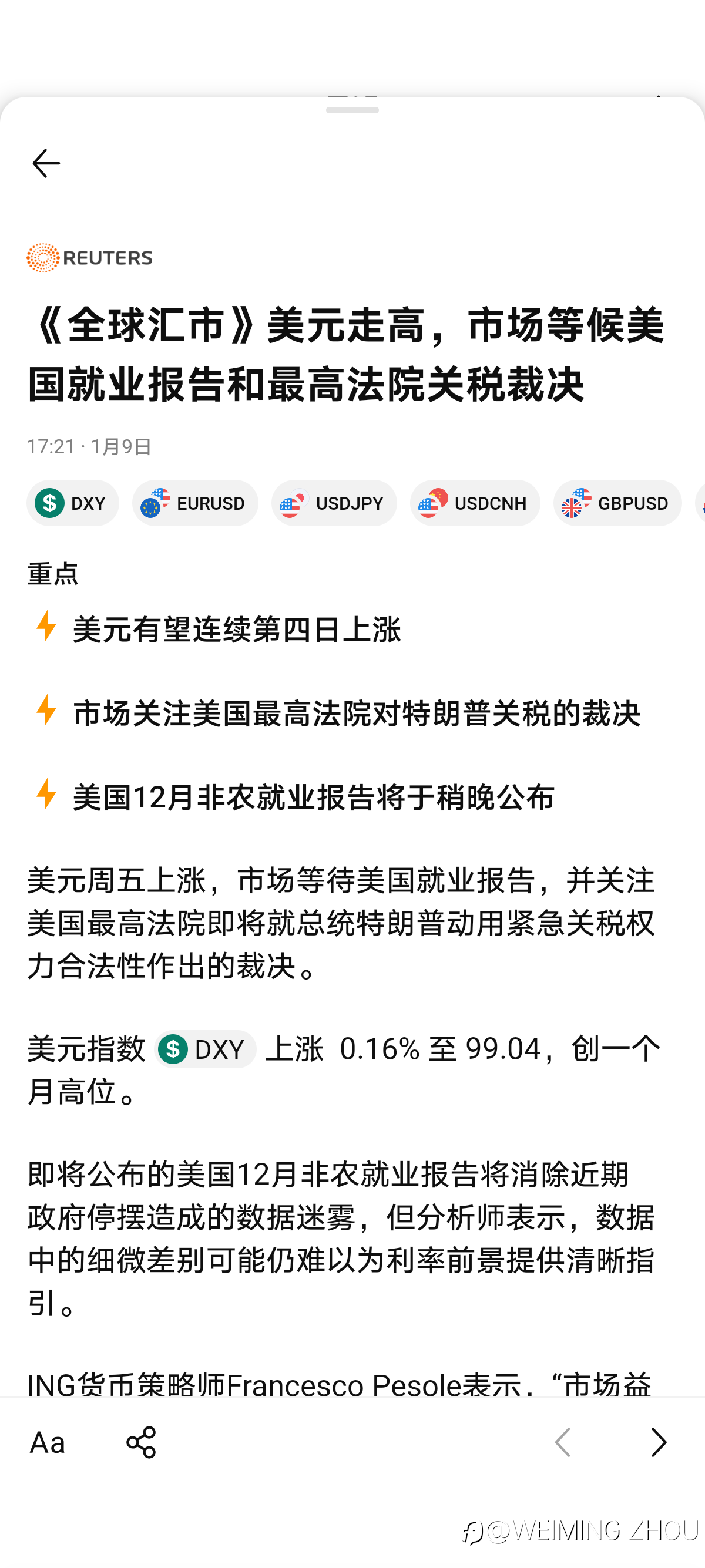 REUTERS 《全球汇市》美元走高,市场等候美国就业报告和最高法院关税裁决